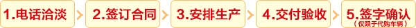 我們將謁誠為您提供更好、更快、更優(yōu)質(zhì)的服務(wù)! ·第一步:購車洽談: 通過電話聯(lián)系或?qū)嵉乜疾烨⒄勡囕v型號、價格和相關(guān)要求。 ·第二步:簽訂合同: 雙方簽訂車輛購銷合同并預(yù)付合同定金(傳真簽訂合同、實地簽訂合同均可)。 ·第三步:安排生產(chǎn): 我公司根據(jù)合同要求,安排車間生產(chǎn)。 ·第四步:交付車輛: 車輛交付驗收,支付車輛余款,完成相關(guān)手續(xù)。 交付方式:客戶可自提車輛,也可協(xié)商由我公司安排送車并協(xié)定相關(guān)費用.更多詳細訂車流程請來電咨詢! |