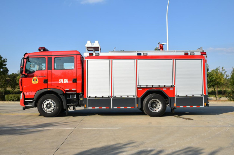 我公司生產(chǎn)的T5G單橋城市主戰(zhàn)消防車采用中國重汽集團濟南卡車股份有限公司生產(chǎn)的ZZ5207TXFV471GF5型二類汽車底盤, 該車原裝雙排駕駛室,可載含駕駛員在內(nèi)的乘員6人,駕乘舒適輕便。該車采用DC-CAFS60/45M型集成壓縮空氣泡沫滅火系統(tǒng),該壓縮空氣泡沫系統(tǒng)操控簡易,泡沫生成實現(xiàn)即時全自動微機精確調(diào)控,并設(shè)多重保護與報警系統(tǒng),消防作戰(zhàn)員可依據(jù)復(fù)雜的火場情況,方便地借助按鈕選擇干泡沫、濕泡沫等不同類型的泡沫滅火方式。該套系統(tǒng)不僅裝有A類泡沫原液,還裝有B類泡沫原液,可高效率地撲滅和控制A、B類物質(zhì)火災(zāi),并具備良好的環(huán)保性能。另外該車配置有牽引電動絞盤,7.6米氣動升降舉升4*1000w照明燈和10.5kw車載發(fā)電機,使得該車還可獨立開展偵查、破拆、救生、照明、防護等綜合搶險救援功能。